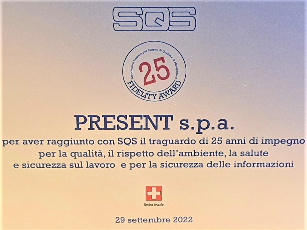 Nella giornata di Giovedì 29 settembre si è tenuta la cerimonia della consegna della targa da parte di SQS Italia a Present per festeggiare i 25 anni di collaborazione tra le due società.