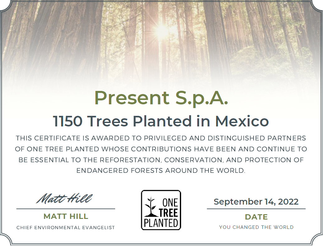 Il conseguimento di tale certificazione testimonia l’attenzione di Present ai temi riguardanti la sostenibilità aziendale al fine di promuovere nuovi valori, sostenendo il cambiamento di abitudini consolidate. Temi che ci auspichiamo possano definire una nuova cultura di economia circolare attenta alla lotta agli sprechi, alla mobilità sostenibile e alla propria impronta idrica ed ecologica.